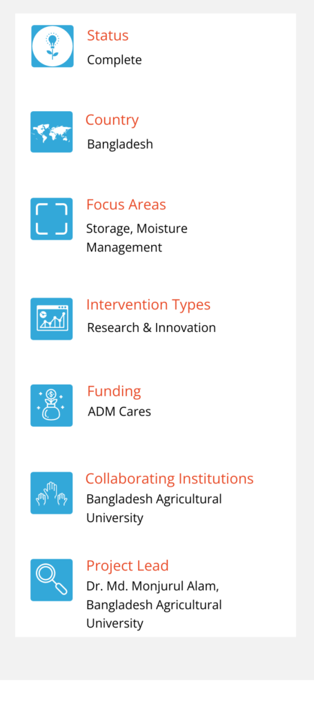 ADMI-sponsored research indicates that Bangladeshi farmers suffer losses of 6% of their grain stored at home over three months following the Boro harvest. Grain stored in permeable jute sacks or traditional bins is susceptible to various forms of infestation as well as variation in moisture content leading to quality degradation. Research further shows that use of hermetically sealed 50 kg plastic bags can reduce storage loss in households to near zero over the same period.